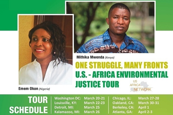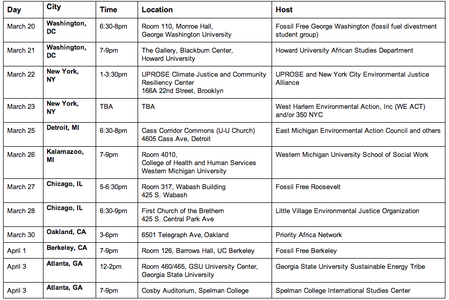 Between March 20 and April 3, the US-Africa Network will be leading a speaking tour in Detroit, Chicago, Louisville, Atlanta, Washington DC, Oakland, and Berkeley. We have multiple events planned in each city. Some of our event hosts are long-time African solidarity activists. Others are community environmental justice groups. And others are student fossil fuel divestment activists. Each event is tailored to its local audience, and many local activists will be included as speakers.