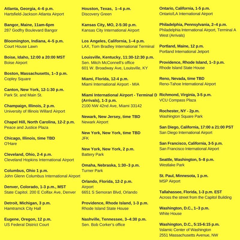 Partial list of #NoBanNoWall demonstrations January 29, 2017